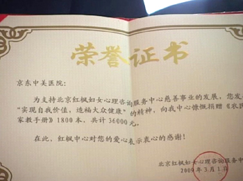 2009年3月5日,由京东中美医院出资36000元人民币印制的1800本《农民工家教手册》,在京东中美医院举行了隆重的捐赠仪式。红枫中心主任徐英代表理事长王行娟老师以及红枫中心参加了捐赠仪式。