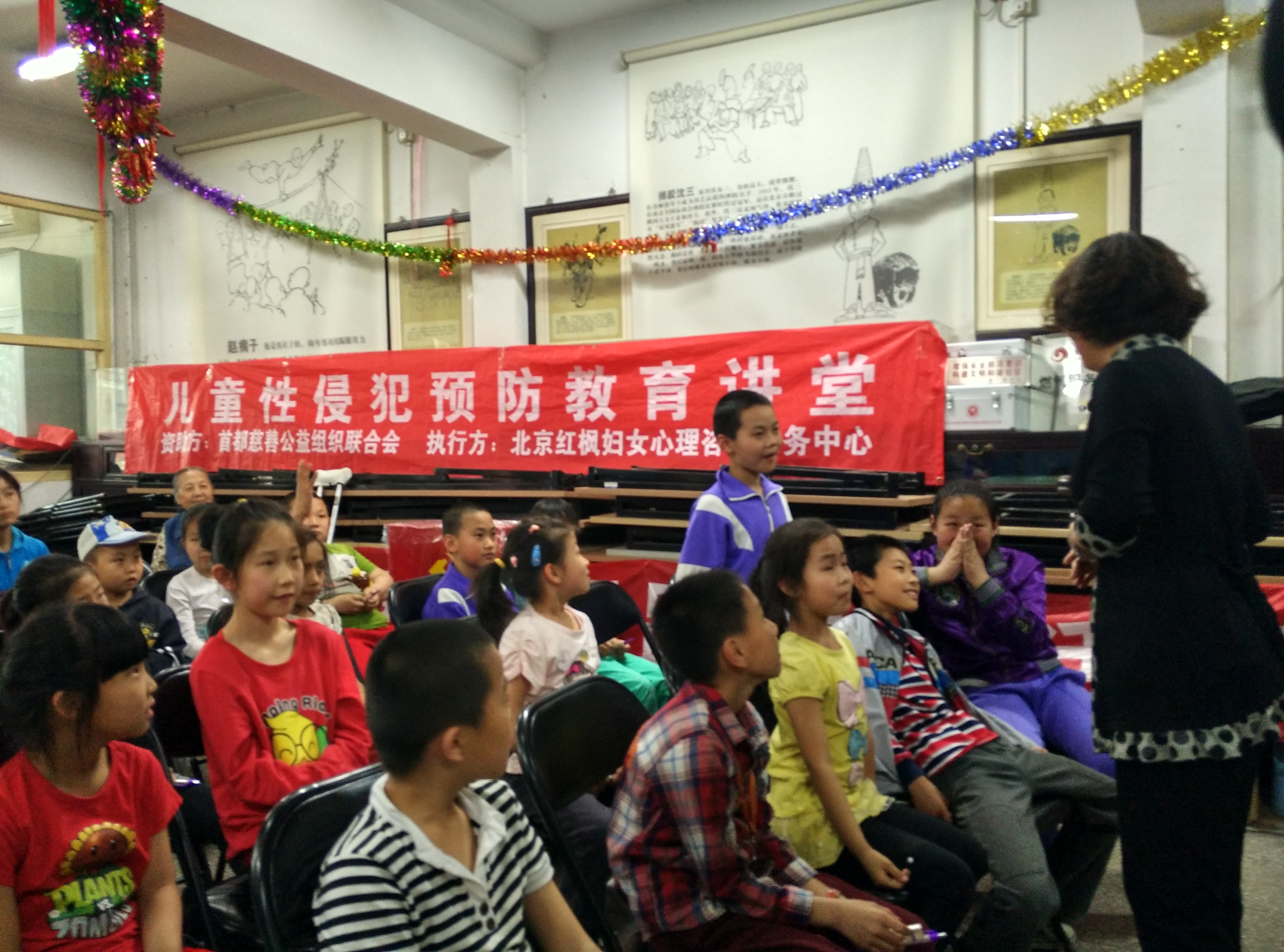 今天是2015年5月8日,在一个艳阳高照的周五下午红枫项目官员张倩与培训老师孙燕一起来到了天桥街道香厂路居委会,准备给这里的孩子们上一堂别开生面的儿童性侵犯预防教育课。下午三点半,三十多名来自天桥社区的三年级、四年级的孩子们准时来到居委会活动中心,可以看出孩子们的心情是好奇。我与居委会的工作人员先发下去课前评测题让同学们填,了解孩子们对于这方面的了解程度。填表结束,讲课正式开始,主讲孙燕老师先让孩子们观看了一段情景剧视频,并向孩子们提问视频中说到的“隐私处”是什么意思?同学们踊跃的回答,有说是不能碰的位置,有说是别人看不到的地方,孩子们都非常踊跃的发出自己的想法。孙燕老师让孩子们带着他们的思考继续又看了一段视频,在第二段视频后孙燕老师告诉孩子们隐私处是神圣不可触犯的,并在后面的互动中告诉孩子们如何防范我们的隐私处,哪些是危险的环境,如果遇到危险要及时报警,报警求救的几种方式,时间过得很快,一个小时过去了,孩子们还在热烈的讨论着,我们按照要求结束了这次大讲堂的内容,通过课后评测表,我们都看到了孩子们的不少改变,这些改变让我们心里暖暖的,希望通过这些课程,让孩子们知道自己的身体自己做主!