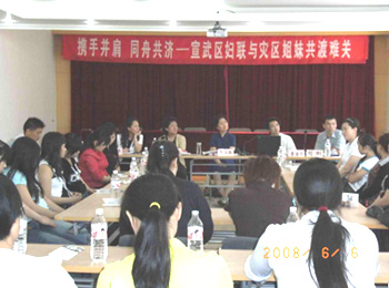 6月6日上午,宣武区妇联举行“携手并肩 同舟共济—宣武区妇联与灾区姐妹共度难关”大会,邀请红枫中心主任胡刚、副主任侯志明和志愿者廉海龙为在京务工的42位灾区姐妹做了心理疏导。